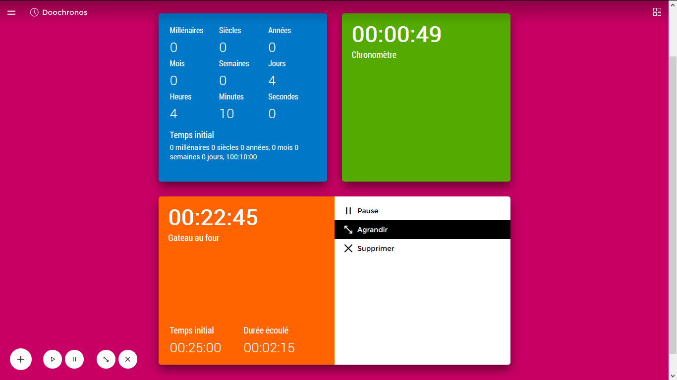 Doochronos est un site web qui permet de gérer plusieurs minuteurs et chronomètres en même temps. Actuellement en version beta, Doochronos ne propose pour l'instant que l'utilisation de plusieurs minuteurs, chronomètres et la conversion de durée.
