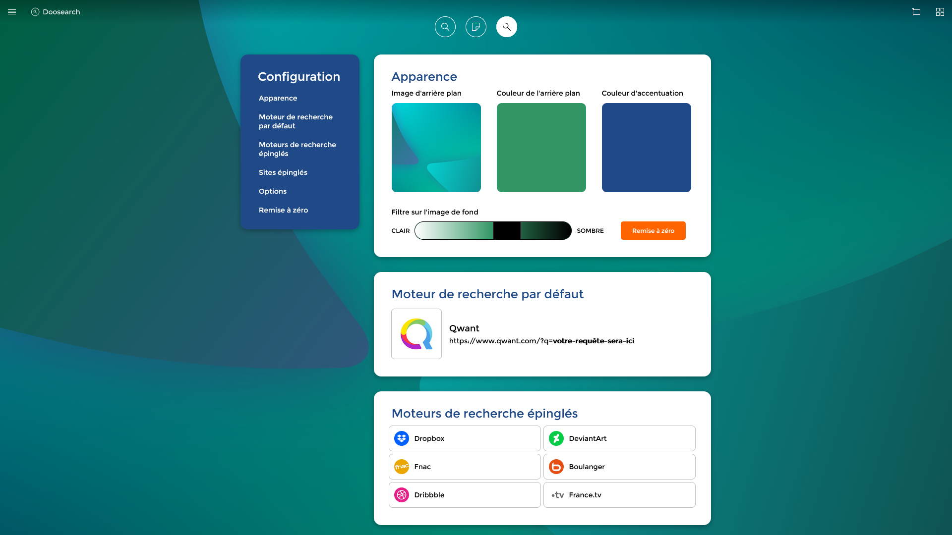 Doosearch est une page web qui propose en une page d'accueil un formulaire de recherche avec la possibilité de lancer une recherche vers plus de 100 sites web différents (dont Google, Bing, DuckDuckGo et Qwant).